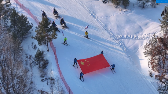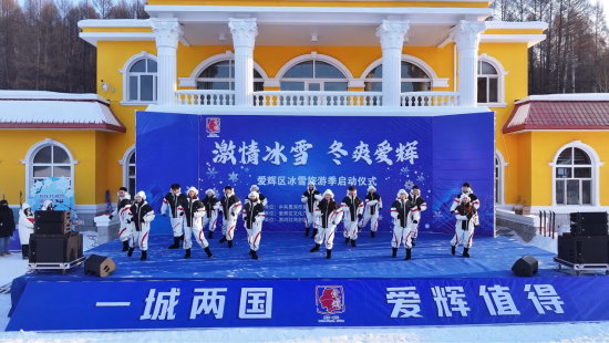 启动仪式现场,展现北疆青年活力的开场舞蹈《奔跑的青春》将现场氛围瞬间点燃。雪地摩托车队绕场巡游,滑雪爱好者手持巨幅五星红旗从高级雪道飞驰而下,上演“中国红”辉映“冰雪蓝”,完美诠释了冰雪运动的激情与豪迈。佳木斯游客薛瑞海表示,这是他们第一次来爱辉,正巧赶上冰雪旅游季开幕,爱辉的美景、良好环境和丰富的冰雪娱乐项目让他们的旅途格外开心。