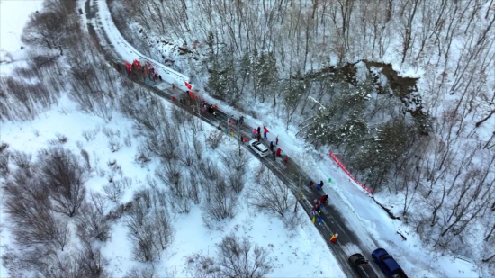 在山口湖穿越之旅现场,气温低至零下 31℃,寒风凛冽中,参赛选手整齐集结,跃跃欲试。