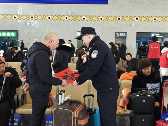 (图为双鸭山西站派出所民警为旅客送上新春祝福)