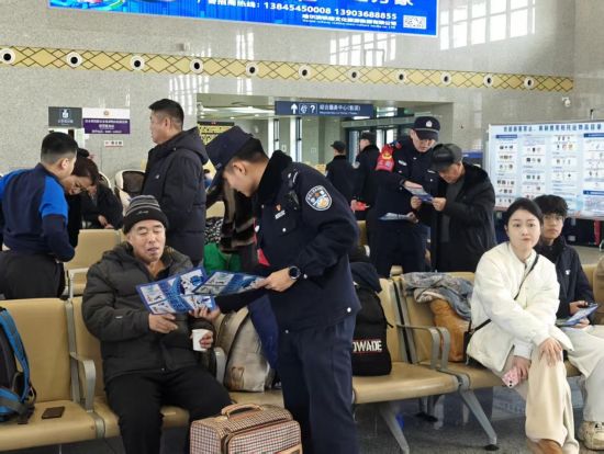(图为双鸭山西站派出所民警向旅客发放安全宣传单)