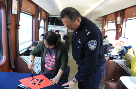 “笔墨送福暖归途”环节,民警邹晨华挥毫泼墨,一幅幅苍劲有力的“福”字和寓意吉祥的春联被赠送到旅客手中,车厢内墨香四溢,年味浓浓。活动尾声,全体旅客与民警共同举起火红的“福”字,齐声高喊“铁警相伴,平安相随”,铿锵有力的口号在车厢内回荡,为旅程注入了满满的安全感与正能量。