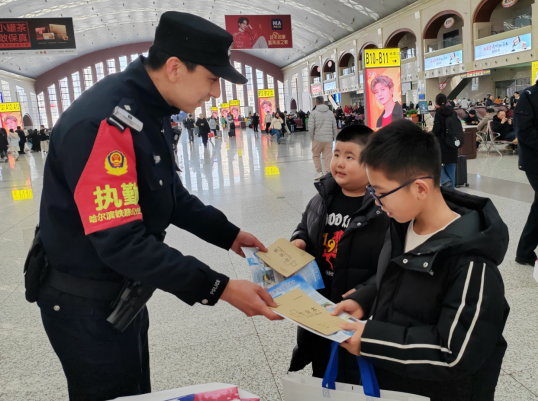 哈尔滨西站派出所民警向过往旅客发放礼物