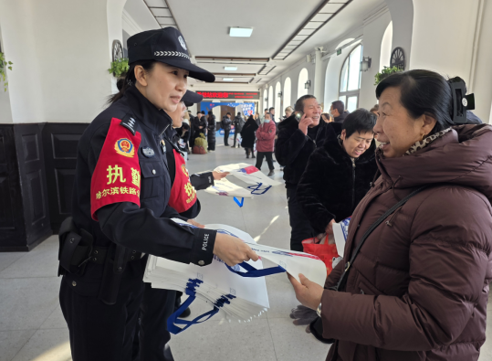 与同日,哈尔滨铁路公安处乘警支队派出宣传小分队,将春运安全课堂开到了旅客身边。活动在欢声笑语中展开:“安全知识小讲堂”上,民警讲解真假车票识别技巧和旅途防盗“秘籍”;“警民互动‘涨’知识”环节,围绕“散装白酒能否携带”“电子烟使用限制”等实际问题进行有奖问答,旅客争相抢答,气氛热烈,简单有趣的问题提高了旅客的常识,也提升了旅客的安全意识。