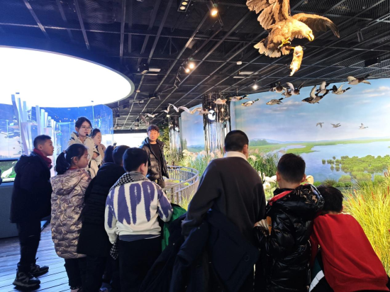 在三江自然生态馆,活动主办方工作人员带领新就业群体的家属和孩子在馆内参观,这些平常缺少陪伴的孩子在生态馆里开阔眼界、增长见识,沉浸式感受家乡生态魅力和地域文化特色。