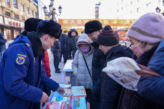 中新网黑龙江新闻2月4日电(栾天)新春将至,年味渐浓。2月4日上午,一场以“赶大集 送安全 平安相伴暖民心”为主题的安全宣传活动在伊春市伊美区西步行街热闹开展。活动由伊春市安委办号召,市应急管理、市卫健委、市教育局、市公安交管支队等部门组建专项宣传队伍,依托步行街年货市集人流密集优势,将安全知识与新春氛围深度融合,为市民游客送上“平安年货”,让安全意识随烟火气浸润人心。