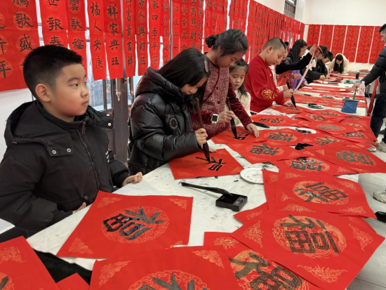 老干部服务中心关工委少年儿童书法爱好者们也手握小毛笔,神情专注地一笔一划临摹“福”字,稚嫩的笔触中满是认真与童真。现场特设的春联领取区热闹非凡,大家或精心挑选现成的春联,或现场请书法爱好者定制专属内容,墨香伴着欢声笑语,温馨又暖心。