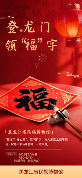 活动介绍:黑龙江省民族博物馆值此农历新春佳节之际,特别推出“登龙门 领福字”新春主题活动。到访参观的游客可现场领取精心准备的新春“福”字,将满满的年味与美好祝福带回家。活动以传统年俗为载体,为每一位游客送上最诚挚的新年祝福——愿大家马年吉祥,一切顺遂!