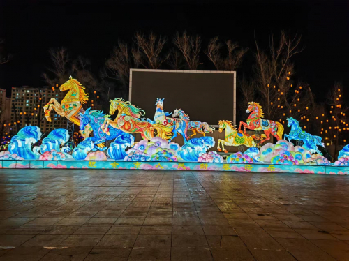 夜空为幕,彩灯流光溢彩,“万马奔腾”灯组传承着“八骏”昂首奋进、气势恢宏的意蕴,让传统意象在绚烂灯影中焕发生机,传递蓬勃向上的精神力量。