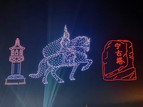 “哇!快看,无人机升空了!” 随着人群中的一声高呼,2000架无人机缓缓升空,将元宵之夜的气氛推向顶峰。夜空为幕、光影为笔,无人机编队在城市上空有序变换、徐徐铺展,将渤海国千年文脉、宁古塔厚重历史与新时代宁安发展图景一一呈现。历史与现实交相辉映,既有对城市文脉的深情致敬,也有对家乡发展的生动展现。