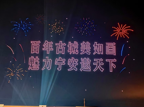 连贯大气的造型凌空呈现,现场欢呼声、赞叹声此起彼伏,市民们纷纷驻足仰望、举机拍摄,沉浸在震撼又温馨的视觉盛宴之中。“我爱宁安”的字样在夜空格外醒目,道出了每一位市民的心声。整场表演气势恢宏、意蕴深远,将文化之美、发展之美融为一体,让欢乐与自豪充盈在城市的每一个角落。