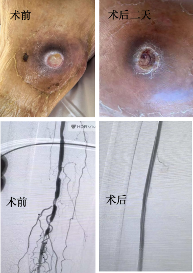面对如此棘手的病情,哈医大四院松北院区普外科(血管外科)佟志国副主任团队第一时间为患者开展全面细致的检查,准确研判病情根源,明确溃疡久治不愈的核心症结在于股浅动脉堵塞、足部供血不足,只有重新打通闭塞血管,恢复足部正常血液供应,创面才能真正实现愈合。考虑到患者高龄、基础疾病多的特殊情况,佟医生团队反复论证手术方案,最终制定了微创血管介入治疗方案,以微小的创伤并降低手术风险,为患者疏通血管“生命线”。