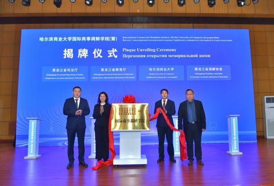 中新网黑龙江新闻3月27日电(记者 刘锡菊)27日,国际商事调解学院成立大会在哈尔滨商业大学举行。黑龙江省司法厅副厅长姜涛、黑龙江省教育厅副厅长程爽、哈尔滨商业大学校长李景义、黑龙江省调解协会副会长董玉庭致辞并为国际商事调解学院揭牌。