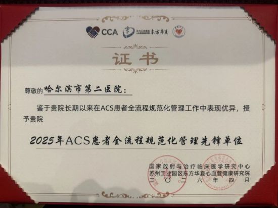 本次大会既是学术交流平台,更是实力比拼、标杆树立的专业赛场。凭借在ACS患者全流程管理中的精细化落地、高效顺畅的急诊救治体系与极强的区域辐射带动作用,哈尔滨市第二医院胸痛中心获组委会高度认可,经严苛评审,正式授予胸痛中心规范化建设先锋单位荣誉。这份权威认定,标志着哈尔滨市第二医院胸痛中心综合实力跻身全国第一梯队,筑牢“二院胸痛”优质品牌根基。