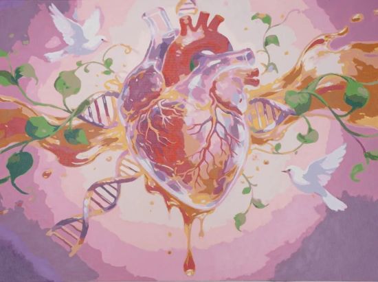 作品以通透水晶心脏为核心,融入金色生命流体、双螺旋DNA,诠释生命传承的科学奥秘;灵动白鸽承载救赎希望,坚韧青藤寓意生生不息,将严谨医学与人文温情完美交融,尽显二院医者的匠心与情怀。