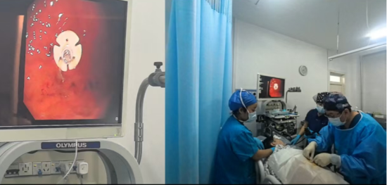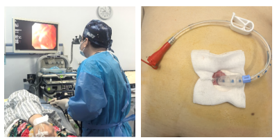 在静脉镇静下,王立国主任医师轻轻将内镜经患者口腔、食管插入胃腔,注气使胃腔充分膨胀,通过内镜透光标记确定最佳穿刺点,通过穿刺针置入导丝,再通过内镜巧抓取导丝引出体外,连接造瘘管并缓慢牵拉至合适位置,确认固定无误后,完成造瘘操作。整个手术仅耗时25分钟,患者术中生命体征平稳,无明显不适。